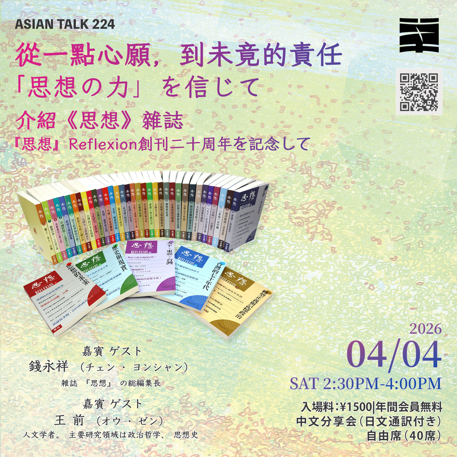 【活动主题】 Asian Talk 224 从一点心愿,到未竟的责任:介绍《思想》杂志 【活动介… 阅读更多 »Asian Talk 224 从一点心愿,到未竟的责任:介绍《思想》杂志
