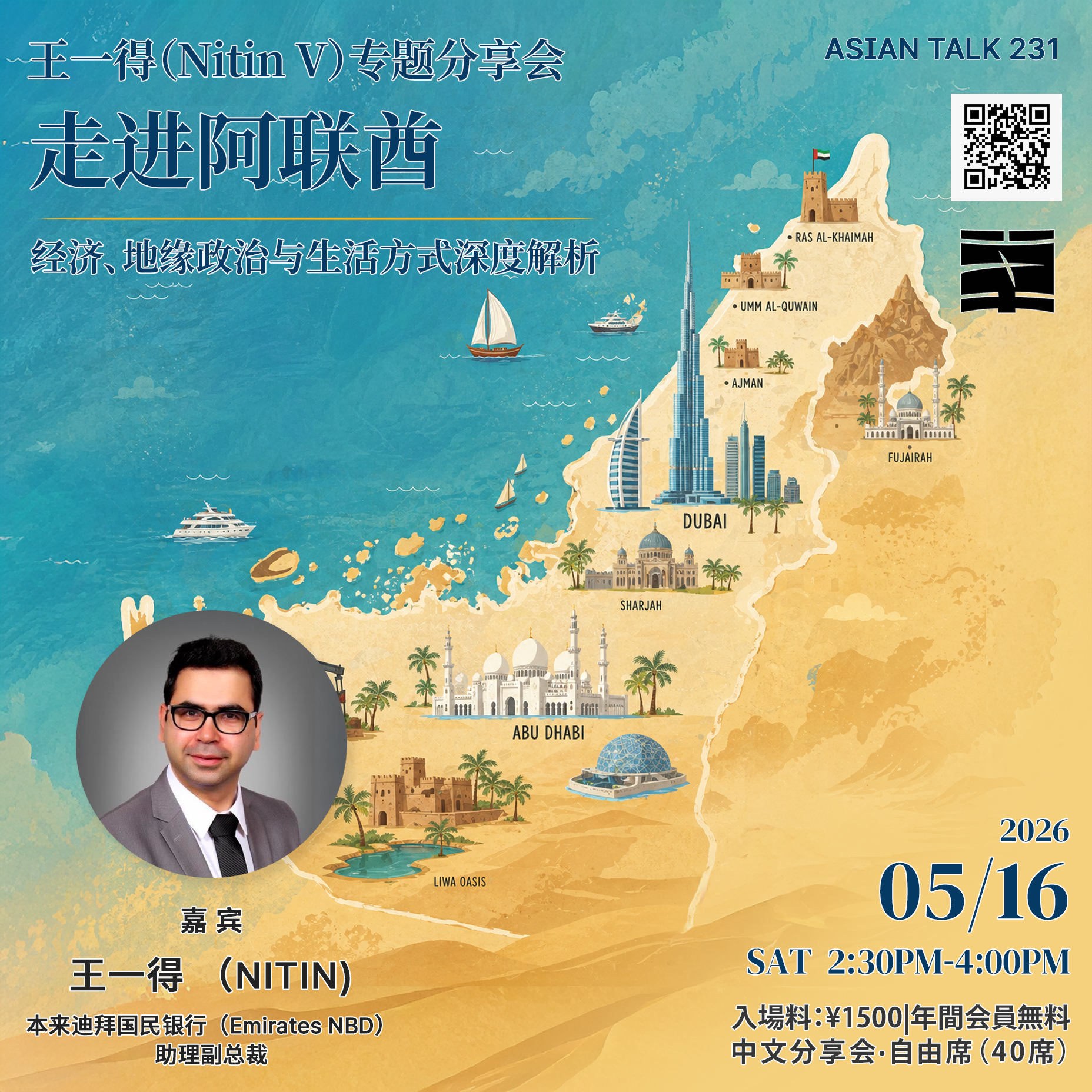 【活动主题】 走进阿联酋:王一得(Nitin V)专题分享会… 阅读更多 »Asian Talk 231 走进阿联酋:王一得(Nitin V)专题分享会 —经济、地缘政治与生活方式深度解析