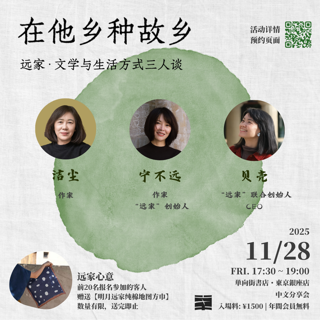 【活动主题】 在他乡种故乡 远家·文学与生活方式三人谈 【活动介绍】 远家是来自中国的生活美学品… 阅读更多 »【远家×东京单向街书店】在他乡种故乡 远家·文学与生活方式三人谈
